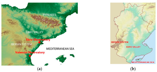 (a) Position of the two observatories. Ebro (40.82° N, 0.49° E) and Valencia (39.49° N, 0.47° W); (b) Relief map of the lower Ebro Valley.