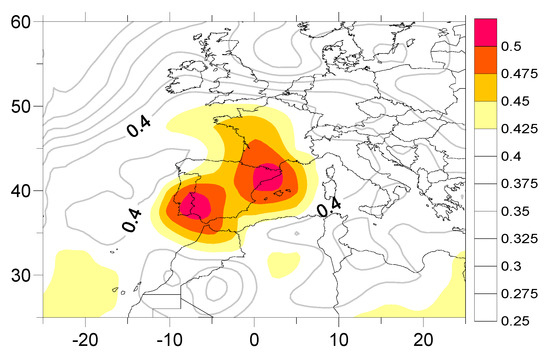 We studied how the differences between the relative vorticity of any random pair of points and the time series of Tx at the Valencia Observatory (TxValencia) correlate. The map in Figure 2 shows the spatial distribution of the maximum values of the former correlations and indicates that the pair of points for which the difference between their relative vorticity values correlate as closely as possible with TxValencia are (7.5° W, 37.5° N) and (2.5° E, 42.5° N). To draw up this map we looked at all the points, searching for the maximum possible absolute value of the correlation between the relative vorticity difference at each point with respect to any other point and the TxValencia time series. First, we calculated the sea level relative vorticity at each point; then we combined the first point with all the others in order to obtain a matrix of values corresponding to the difference of relative vorticity between the first point and all the others. Then we computed another matrix from the absolute value of the correlations between the elements of the former matrix and TxValencia. Finally, we selected from that matrix the maximum absolute value, which is the value plotted in Figure 2 corresponding to the first point. This procedure was applied to all the other points.