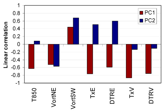 Figure 3 shows the correlations of the seven entry variables of the analysis with the first and the second principal components (PC1 and PC2, which account for 65% of the total variance of the set of the seven variables). This graph shows how the structure linked to PC1 corresponds to a weather pattern which generates a homogeneous behaviour at both observatories with respect to both the Tx anomalies and the DTR ones. Although the structure linked to PC1 explains the greater proportion of variation (44%), we focused on the structure linked to PC2 as it adjusts exactly to what we are searching for: changes in vorticities (VortNE, VortSW) linked to a considerable increase in the Tx and DTR at the Ebro Observatory and at the same time to a discrete drop in the Tx and DTR at the Valencia Observatory. Therefore, PC2 is related to a weather pattern linked to important deviations in Tx and DTR anomalies at both observatories. The correlation obtained between PC2 and the difference TxEbro–TxValencia is very significant (r = 0.72, >99%).