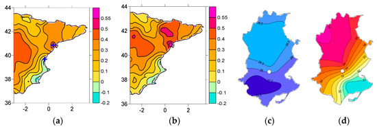 (a) Daily correlations between Tx and PC2 (top blue cross—Ebro Observatory, bottom blue cross—Valencia Observatory); (b) Daily correlations between DTR and PC2; (c) Average value of maximum temperatures in lower Ebro Valley (PC2 < 10th percentile) (1996–2006); (d) Average value of maximum temperatures in lower Ebro Valley (PC2 > 90th percentile) (1996–2006). White point indicates the location of the Ebro Observatory, to the NW of the Ebro delta.