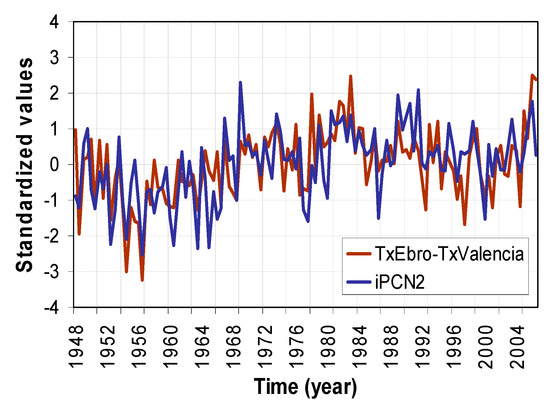In the 1950s and early 1960s, during the Northern days (the frequency of which was significantly higher than usual [29]), the iPCN2 and the SNAO values were frequently negative, restraining maximum temperatures in northern IP due to the northerly flow linked to a marked westward pressure gradient and maintaining a reduced DTR in the area around the Ebro Observatory. However, in the same period, these negative values of iPCN2 and the consequent negative values of the relative vorticity in the SW IP contributed to increasing the Tx and DTR in the area around the SE IP and Valencia region close to the coast and also increased the frequency of days with westerly winds (‘ponentades’). So, we can conclude that in the 1950s and early 1960s, the atmospheric circulation enhanced the frequency of westerly flow and the probability of extreme temperatures in that region. In the 1950s and early 1960s, therefore, the maximum temperatures and DTR at the Ebro and Valencia Observatories showed a certain convergence.