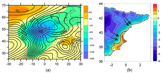 The maps of Figure 6a,b show, for 10% of the Northern days with the lowest values of iPCN2 respectively, the spatial distribution of mean values for MSLP and Z500 anomalies and the Tx anomalies of the eastern IP. The negative SNAO signal becomes evident in the large area of low pressure in north Europe. From the strong westward pressure gradient over the IP we can expect a significant northerly wind (especially at the Ebro Observatory, thanks to its orographical conditions). The area of negative Z500 anomalies centred to the north of the Cantabrian Sea, which affects the northern part of the Iberian Peninsula, indicates the presence of cold air at high levels. Due to this, we can expect a reduction in the temperatures over the northern part of the IP.