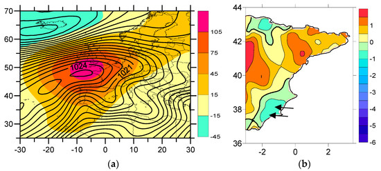 (a) MSLP (hPa) and Z500 (gpm) anomalies (iPCN2 < 10th percentile); (b) Average value of the Tx anomalies in the east IP (iPCN2 < 10th percentile). The positive Tx anomalies of the SE IP are to the right of the thick line. Black arrows represent the direction of the air flux.