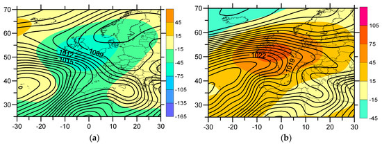 (a) MSLP (hPa) and Z500 (gpm) anomalies for the 5 months with the most negative values of iPCN2; (b) MSLP (hPa) and Z500 (gpm) anomalies for the 5 months with the most positive values of iPCN2.