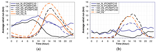(a) For Ebro Observatory, average hourly wind run for iPCN2 < 10th percentile (run_N in blue line and run_2q in blue dashed line) and for iPCN2 > 90th percentile (run_N in black line and run_2q in black dashed line. Run_N corresponds to the wind run of the wind with positive northerly component and run_2q to the wind run of the second quadrant wind), average run_2q in Southern days (orange dashed line) and average run_2q in Northern days (orange line). The average hourly wind run was computed by dividing for each hour, the integration of the wind run from one specific direction throughout the days of each sample and the number of days of that sample. (b) The same for Valencia but here it is shown the average run_2q (orange dashed line) of the whole set of days.