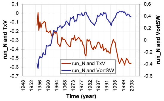 We must point out that the period during which the correlation between run_N and VortSW changed sign (from the 1950s to the beginning of the 1980s) (Figure 10) coincided with a change in the iPCN2 index (from negative to positive) (Figure 5), a change in the SNAO index (from negative to positive [21]), a large increase in the difference between the Ebro Observatory Tx with respect to those of the Valencia Observatory (Figure 5), a large increase in the Ebro Observatory DTR and a large fall in the Valencia Observatory DTR (Figure 11).