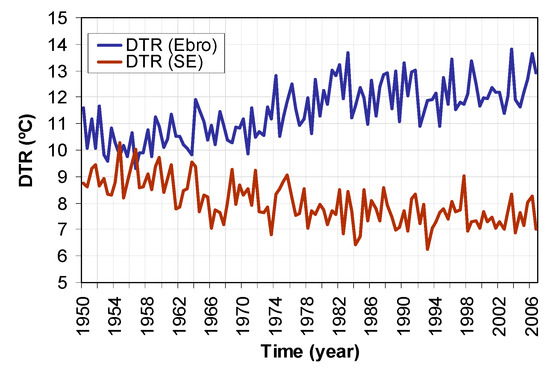 The 20th century saw a worldwide rise in temperature of 0.89 °C [1] but this increase was not a uniform one all around the globe, neither spatially nor seasonally [2,3]. Actually, this increase was not a progressive one either and was, in fact, produced during two different phases. The first one lasted from 1910 to 1945 [4], while the second—and much more significant—phase has lasted from 1976 onward. From 1950 to the 1970s, a slightly negative trend was recorded. On the other hand, minimum temperatures increased at a faster rate than maximum temperatures during the latter half of the 20th century resulting in a significant decrease in the DTR (diurnal temperature range) for this period [5]. Furthermore, this widespread decrease in the DTR was only evident from 1950–1980 [6]; that is to say, maximum and minimum temperatures have increased roughly at the same rate from the beginning of the current period of global warming.