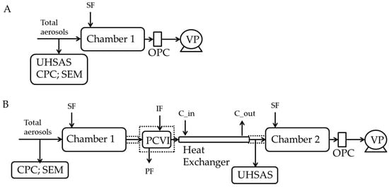 Experiments A and B (see Figure 1) at various temperatures (−26, −28, −30, −32, and −34 °C) were performed on the same day. The aim of experiment A was to determine the immersion freezing efficiency of total ambient aerosols with chamber 1. In experiment B, the immersion freezing efficiency of IRs was investigated using both chambers 1 and 2. Specifically, chamber 1 was used to form ice crystals from INPs present in the total aerosol population. Next, the grown ice crystals were separated using PCVI and transported through the heat exchanger to obtain the IRs. The PCVI output flow and heat exchanger conditions produced efficient sublimation of ice crystals (see below). These IRs are further transported to the UHSAS and chamber 2. Table 1 shows the average UHSAS concentration at different temperature values.