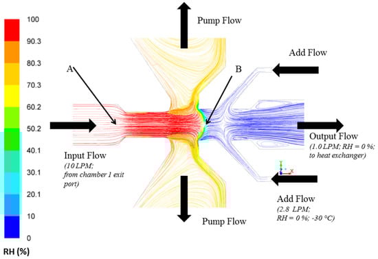 CFD simulations using experimental flow conditions (Figure 1) were performed in this study to confirm that the output flow that carries large ice crystals separated by the PCVI is dry (RH = 0%) (Figure 2). These flow conditions led to the sublimation of ice crystals within the PCVI (output flow) and the heat exchanger. More information regarding velocity vector direction and flow conditions within the PCVI (labels A and B in Figure 2) obtained through simulations are shown in Figures S2 and S3. The notation RH represents RHw henceforth.