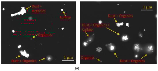 SEM with the EDS technique provided the elemental composition of the total aerosol particles. The composition results revealed that minerals coated with organics dominated the total aerosol particle population (Figure 4). Pure organic particles were also identified. It was not possible to discern the type of organic substances that were condensed on mineral dust particles, but they could represent a multi-component solution of various organic molecules.