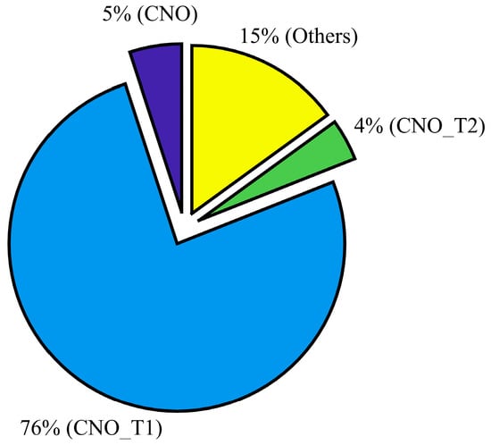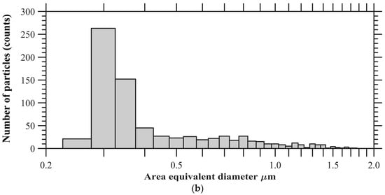 The particles were collected in parallel with ongoing ice nucleation experiments (Figure 1) on a carbon type-B support film (Ted Pella, Inc., Redding, CA, USA; 01814-F). Particles were not coated with electrically-conducting metals (e.g., gold, platinum) to enhance the image quality in this analysis. The mesh grid was located on the C- and D-stage of the SKC Sioutas impactor that had a 50% cutoff diameter of 0.5 and 1.0 μm, respectively. Figure 3a shows the example of SEM images of representative individual particles collected from the C-stage. Approximately 1000 randomly selected particles were used to determine the elemental composition of total aerosol particles, and this atomic wt % data was further analyzed to categorize the particles into various subgroups: CNO, CNO_T1, CNO_T2, and others using the classification scheme (Table 2) that was formulated to understand the general composition of particles in a semi-qualitative manner. Figure 3b shows the size distribution of these selected particles. The particle diameter is based on area equivalent diameter reported by the SEM-EDS instrument.