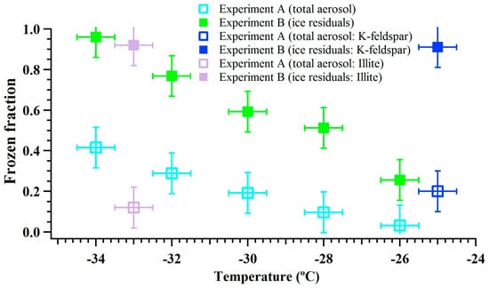 Figure 5 shows the frozen fraction of total ambient aerosols and IRs in the immersion freezing mode as a function of temperature (−26, −28, −30, −32 and −34 °C). In water-saturated conditions, it is assumed that particles are activated in a droplet prior to freezing. The vertical and horizontal error bars show the uncertainty in calculating the frozen fraction and the temperature measurements, respectively. In general, the results show that the magnitude of frozen fraction increased with decreasing temperature, which is in agreement with many previous immersion freezing studies (e.g., [49,50]). The results that verify the experiment B are also shown in Figure 5. It was observed that the frozen fraction of total aerosol and ice residuals was ~0.2 and nearly one, respectively. This shows that all the IRs from chamber 1 induced nucleation of ice in the chamber 2 and suggest that local surface features that were responsible for nucleation of water ice on these particles were unaffected after first ice nucleation event (chamber 1). Recently, Kiselev et al. (2016) [51] through a combination of experimental observations and molecular-level model simulations concluded that surface defects such as steps, cracks, and cavities are the ice nucleating active-site features of the K-feldspar particle surface. This implies such features may be responsible for ice nucleation on the surface of dust particles in the chamber 1, and they were also responsible for ice nucleation in the chamber 2. The ice crystal sublimation and residual drying processes in experiment B (Figure 1) seem do not affect the ice nucleating ability of these surface features. In addition, the size distribution of ice residuals was obtained by collecting residuals after the heat exchanger (Figures S6 and S7). As DMA does not classify monodispersed dust particles, larger (multiple-charged) particles were also transmitted in addition to the 250 nm size particles (Figure S7).