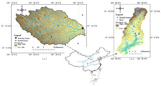 Figure 3). The first one is the upstream of the Qingjian River basin (109°12′–109°44′ E, 37°01′–37°19′ N), a tributary of the Yellow River. The second one is the Longxi River basin located in Sichuan province (103°30′–103°36′ E, 31°01′–31°11′ N), a tributary of the Min River that flows into the Yangtze River. The digital drainage networks of these two river basins are also shown in