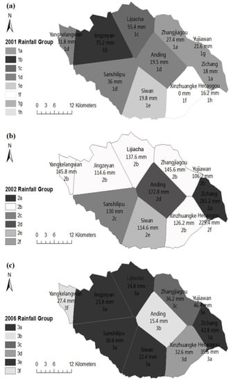 The classification results of these rainfall stations show that, generally, in a rainfall event, some of the stations have the statistically uniform rainfall process and total depth. Moreover, the stations in the largest group are generally close to each other. For example, the stations in group 2b of the 2002 rainfall event are mainly located in the north of the basin, except for Xinzhuangke; the stations in group 3a of the 2006 rainfall event are mainly located in the west of the basin, except for Zichang.