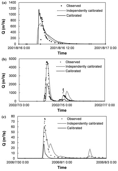 Figure 5, the dash lines of the independently calibrated runoff processes can basically overlap the points of the observations, especially for the 2002 and 2006 rainfall events. With reference to the NSE of flow discharge, it is observed that the NSE values of these three rainfall-runoff events are all significantly improved, from 0.48, 0.43 and 0.05, to 0.61, 0.81 and 0.80, respectively. Such results proved that the DYRIM can represent these rainfall-runoff events in a sufficient way. It is worth noting that the impact of model calibration on results (i.e., the NSE value) is sometimes more significant than the influence of rainfall spatially uncertainty on results. Because the runoff of the 2006 rainfall event is much smaller than the other two events with the measured peak discharge of 76 m