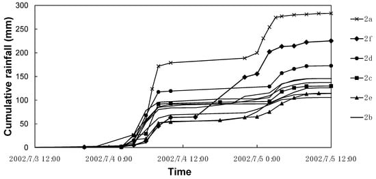 Table 2). The three events are different from each other, not only in the order of magnitude of the measured peak discharges, but also in runoff coefficients. The 2002.7.3–7.7 rainfall event has the heaviest rainfall of 145 mm, leading to a flood with peak discharge of 4670 m