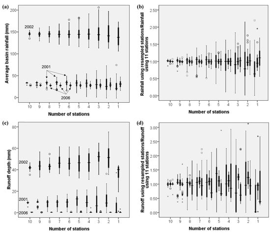 Figure 7c,d, it can be observed that the simulated runoffs using the resampled partial stations present a larger range of non-dimensional uncertainty than the average basin rainfall. The uncertainty of the rainfall input is amplified by the rainfall-runoff process, resulting in greater uncertainty of the simulated runoffs.