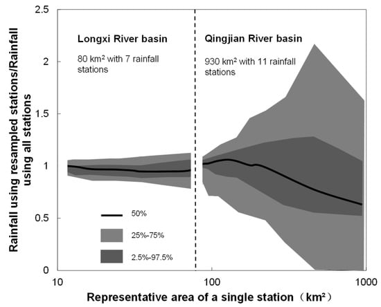 Figure 8). The horizontal axis is the mean representative area of a single station that calculated from a certain number of the resampled stations (e.g., if 10 stations are selected for uncertainty estimation in the Qingjian river basin with 930 km