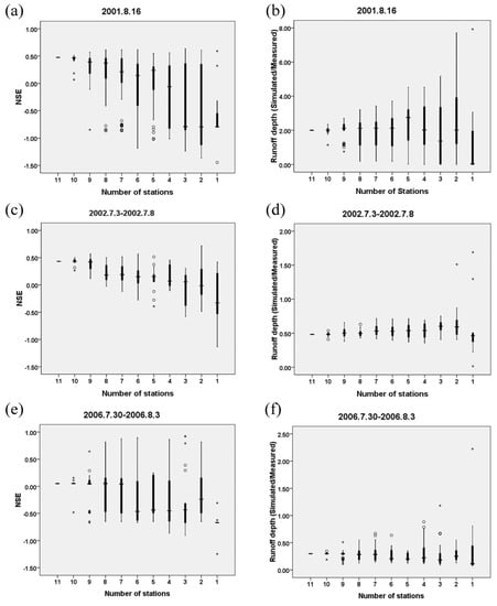 Figure 9e) reduces to −0.48 (using 10 stations) from 0.05 (using 11 stations). As a result, it can be concluded that, with certain rainfall input combination, if the rainfall center is not captured and applied to the hydrological model, a large portion of the actual rainfall will be ignored in the rainfall-runoff simulation, resulting in significant deviation in simulated runoff. Even though some methods can produce high-intensity rainfall cells in a river basin, e.g., the geostatistical conditional approach used by Vischel et al. [