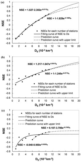 DS values (the dot dash line), the NSE will further increase, implying that the runoff simulation results will be improved. However, even if we can install as many rainfall stations as possible over the river basin, there is a limit of the NSE because of temporal uncertainty of rainfall, as well as the inherent uncertainty of the hydrological model and parameters. According to this trend, the exponential fitting curve is proposed as: