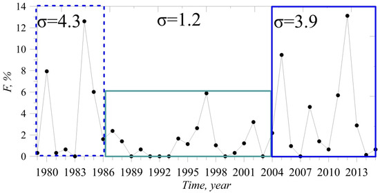 We calculated the blocking event frequency as a percentage. The product of days in a wintertime (t = 120 or 121) and the number of grid points (l = 13) within the 60° E–90° E range at the 2.5° grid step was taken as 100% (the greatest possible number of realizations). The frequency was calculated as the ratio of the total of the blocking days (with 5-day and longer blockings) to the greatest possible number of realizations.