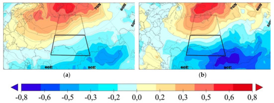 Figure 2 demonstrates correlation maps between the blocking frequency over Western Siberia and the surface temperature at the grid points for November–December (Figure 2a) and January–February (Figure 2b). The blockings detected over Western Siberia determine the temperature anomalies over a large territory considerably exceeding the size of the region. One can see that the correlation field over Western Siberia has a dipole pattern. In the north of the region, an increase in the surface temperature corresponds to the increase in the blocking frequency, whereas in the south, the surface temperature decrease corresponds to the increase in the blocking frequency. The solid and the dashed curves outline the southern part of Western Siberia (60° E–90° E; 50° N–60° N) and the northern part of Western Siberia (60° E–90° E; 60° N–70° N), respectively.