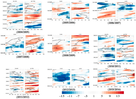 Figure 3 shows nine time-longitude cross sections of the surface temperature anomalies for 14 winter blocking events over Western Siberia. The calculations were carried out separately for the southern part of Western Siberia (left panels) and the northern part of Western Siberia (right panels). Negative surface temperature anomalies in the south of Western Siberia during blockings were detected in 12 cases of 14. During two blocking events, the temperature anomaly in the south of the region are close to the norm (event 2008/2009; the third blocking within 2010/2011). Thus, the temperature anomalies in the south of Western Siberia accompanying these blockings are negative or close to norm.