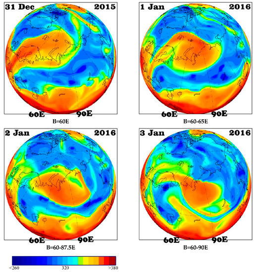 Let us reveal what drove the surface temperature anomalies that we detected during blocking events over Western Siberia. A blocking is a dynamic phenomenon. Therefore, it seems obvious that dynamic, advective factors should play the main role in surface temperature variations. For the advection analysis, we used the potential temperature at the dynamic tropopause (PV2-θ) [4,14,15]. The dynamic tropopause, with some assumptions [15], may be considered a quasi-material surface along which air masses are transported. Therefore, the PV2-θ is a convenient characteristic for analyzing their origin [14]. We analyzed the PV2-θ fields for all the 14 blocking events. To present in figures, we selected only two events that reflect most fully all the main features of the dynamics of the investigated blockings. Those were the second blocking within 2010/2011, and the 2015/2016 blocking. A dipole pattern of the surface temperature anomalies corresponds to the 2015/2016 blocking. Figure 4 shows the PV2-θ distributions for this event. Figure 5 provides the PV2-θ fields for a “non-dipole” situation, which was the second blocking of 2010/2011.