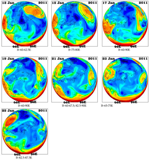 The blocking in Figure 5 and on the corresponding diagram of Figure 3 evolves differently. From 13 through 17 January, there evolves a weak (as compared with the previous case) advection of warm air over Western Siberia. Simultaneously, a strong blocking event evolves over the Russian Far East and Alaska (up to about 19 January 2011). Additionally, from about 18 January 2011, advective transports over Europe intensify, and a strong blocking evolves there. Although Western Siberia in the addressed case has a local advection, these processes nevertheless occur insignificantly, because the main processes of the warm air advection occur over the North Pacific and Europe. Through the territory of Western Siberia, there is an intense cold air advection: first, into the system of the Far East blocking, and then, into the system of the European one. There is an attempt of warm air transport directly over Western Siberia in January 2011. However, this transport is too weak to provide a steady dipole pattern in the PV2-θ and in the surface temperature anomalies.