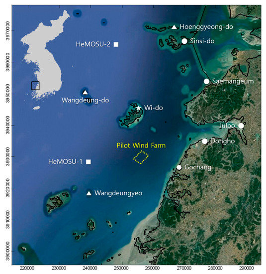 Meteorological towers were installed on nearby islands to alleviate the uncertainty in the wind resource assessment at the pilot wind farm. The measurement data for 12 months—which were measured by attaching sensors to a broadcasting tower (altitude above sea level: 184 m) in Wangdeung-do, which was 22 km away from the north of HeMOSU-1—were employed. Jeong et al. [14] installed an 80 m-high meteorological tower in Wangdeungyeo (altitude above sea level: 30 m), 8 km away from the south of HeMOSU-1; the monthly wind speed data for 24 months were adopted from their paper. In addition, Shim et al. [15] installed a 30 m-high meteorological tower in Hoenggyeon-do (altitude above sea level: 40 m) located north of Saemangeum Gogunsan-do; the monthly wind speed data for 12 months were adopted from their paper.