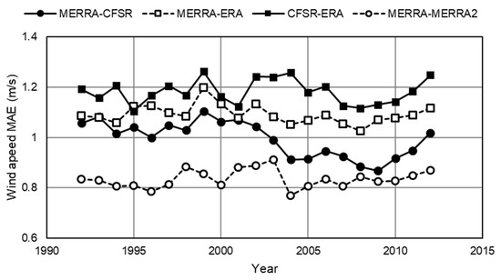 Inter-annual variation of MAEs of wind speed differences between reanalyses.