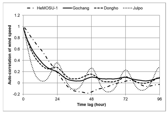 Figure 5 depicts the autocorrelation of the wind speed measurement data. The measurements at HeMOSU-1 influenced by oceanic weather with low variability, Gochang on the coast showed a reduction tendency in autocorrelation coefficient monotonically according to a lag time. In contrast, Julpo on the coast inside a bay located inwardly in the inland showed clear periodicity of 24 h due to the effect of the sea-land breeze system. Dongho located in the entry of the bay also has 24 h periodicity, although it is weaker than that in Julpo. Julpo is located 20 km inward to the inland from the bay entrance, and it has topographic characteristics shielded by 509 m-high and 444 m-high mountains in the north and south, respectively. Thus, ventilation would occur only through the open east-west direction.