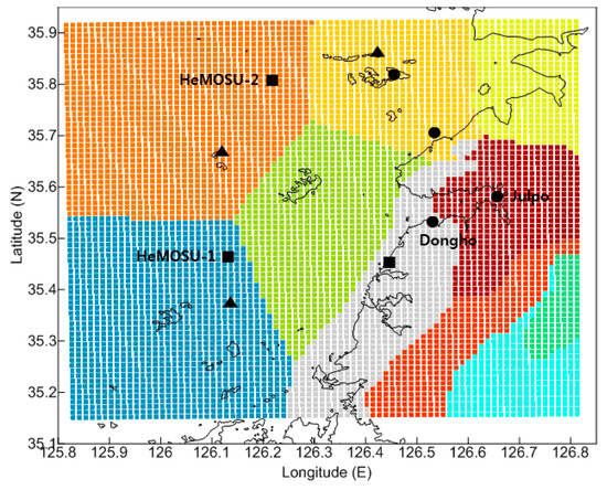 From the analysis with Table 8 and Figure 5, it is conjectured that the intensity of local wind system increases as penetrates into inland from offshore through onshore. This implies that offshore wind resource assessment using onshore or inland measurement data would cause considerable misinterpretation. According to a wind sector clustering map shown in Figure 6, classified by a surface wind regionalization method proposed by Kim et al. [18], offshore meteorological towers HeMOSU-1 and HeMOSU-2 belong to a different wind sector, whereas Dongho and Gochang belong to the same wind sector along the coast; Julpo, which is located inland, is classified into a separate wind sector.
