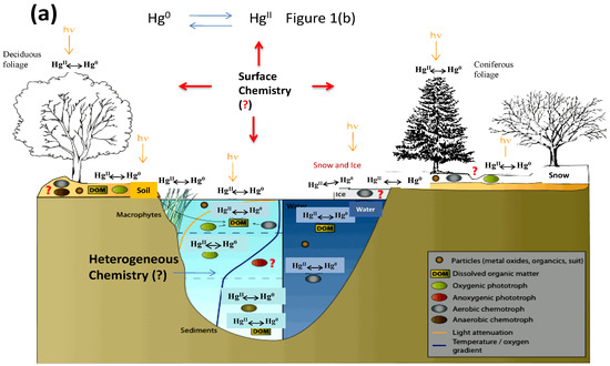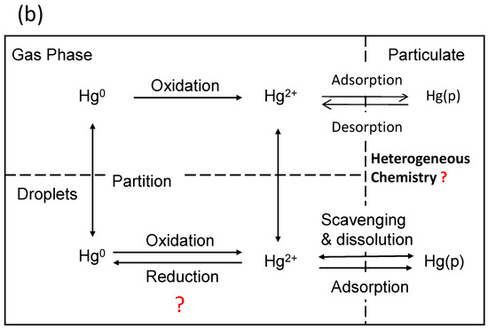 (a) Mercury transformations in the environment; (b) Atmospheric chemistry of mercury. Adapted and modified from [3]. The question mark (?) indicates some major knowledge gaps in Hg cycling in the environment.