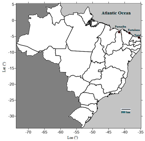 Map of Brazil with the representation of study regions: Fortaleza, Natal, and Parnaíba.