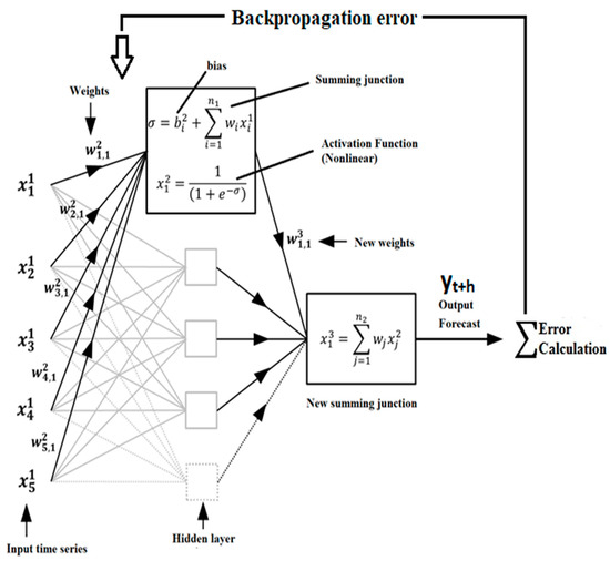 where bj and wi,j are parameters discovered in the “learning” step from the observed data of the current time-series. It is worth noting that the weights may initially assume random values which, in turn, will be updated using the observed data. In the hidden layer, Equation (3) is modified using a nonlinear function, such as a sigmoid given by the following expression