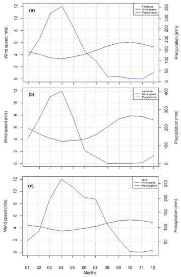 Monthly mean wind speed (black line) and precipitation (blue line) time-series in (a) Fortaleza; (b) Parnaíba; and (c) Natal.