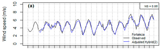 According to a study carried out by the National Institute of Meteorology (INMET (http://www.inmet.gov.br/portal/index.php?r=clima/normaisclimatologicas (accessed on 3 September 2016))) regarding the climatological normals throughout all of Brazilian territory, the months of greatest precipitation (called the rainy season) in the city of Fortaleza are between February and May, peaking in April. According to Camelo et al. [36], the monthly mean wind speed intensity for this season in Fortaleza is lower than the period of low precipitation (called the dry season), which is between October and December. In the case of the Hybrid(2) model, it is possible to identify in Figure 4a that the model is able to represent seasonal characteristics of the wind speed in Fortaleza; there are lower intensities in the rainy season and higher intensities for the dry season. Still, according to INMET, regarding the historical series of precipitation in the cities of Natal and Parnaíba, both presented a rainy period in the first semester of the year. In Natal, this was between March and July (with a peak in April), and in Parnaíba, this was between February and May (also with a peak in April). In the same way as Fortaleza, the Hybrid(2) and Hybrid(3) adjustments in Natal and Parnaíba, respectively, were also able to represent the seasonal wind characteristics of the series observed in both regions, i.e., lower intensities occurring in the rainy season, and higher intensities in the dry season.
