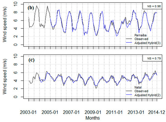 Monthly wind speed in (a) Fortaleza; (b) Parnaíba; and (c) Natal. A comparison between observed (continuous line in black) and adjusted (continuous line in blue) time-series. Information is given about the NS value to identify the fitting quality in each region.