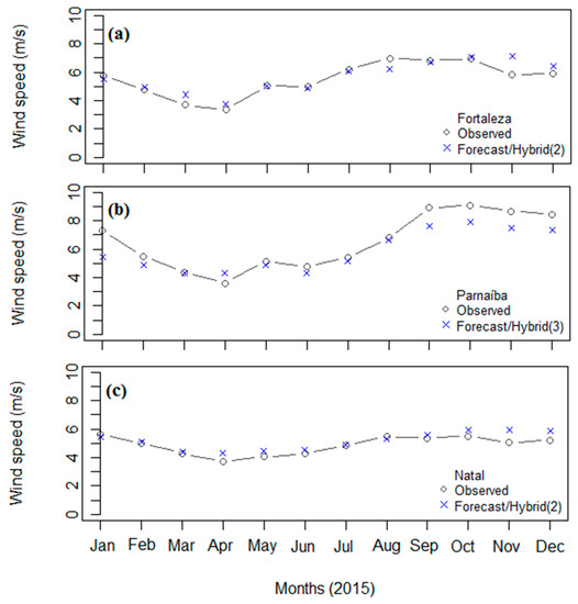 To further illustrate the quality of the Hybrid(2) and Hybrid(3) models, forecasts were made for the following year of observations, i.e., for the months of 2015. These were compared with the observational data of that year. Figure 5 shows these comparisons for Fortaleza (Figure 5a), Parnaíba (Figure 5b), and Natal (Figure 5c), where the observed time-series are represented as empty circles and the predicted time-series are represented as solid black circles. The results of these comparisons show the efficiency of the model with respect to the monthly wind speed averages forecast. They are able to follow the profile of the series observed in the three regions, showing values very close to each other. For example, in Natal, the forecast and observation values for February 2015 were similar at approximately 5.0 m/s. It is important to emphasize that this precision was already expected on this occasion as influence is received from the perfect adjustments. Another detail identified about the forecasts is that they can also represent the seasonality of their respective observed time-series, i.e., lower and higher wind speed intensities according to the rainy and dry seasons.