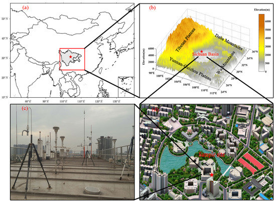 A synergistic suite of monitoring facilities with air quality was situated on a building rooftop at the Southwest Jiao-tong University (30.69° N, 104.05° E; 30 m altitude), which is located in a suburban area of Chengdu. The instruments included a Micro Pulse Lidar (MPL, wavelength at 532 nm; pulse energy at 6~8 μJ; repetition rate at 2500 Hz; Diameter at 178 mm; Enviro Technology Services, London, UK), a Sun-photometer (CIMEL CE-318, wavelength at 532 nm; Cimel Electronique S.A.S, Paris, France), a visibility sensor (FD12P), a semi continuous OC/EC analyzer (SUNSET RT-4, Sunset Laboratory Inc., New York, NY, USA), a meteorological station (FRT-X2), and an automatic air quality monitoring station, for analyzing in situ samples for PM2.5 and PM10 concentrations (Beta Attenuation Particulate Monitor (BAPM), MetOne-1020; Met One Instruments’ service, New York, NY, USA) and gases (NOX/NO/NO2, CO, SO2, O3, Hydrocarbons/Total VOC and Benzene).