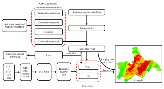 - A script was used to automatically download the near real-time product from NASA. The original downloaded high-resolution MODIS product was first preprocessed via the Geospatial Data Abstraction Library (GDAL) Air module (including the radiometric and geometric corrections, resampling, and masking), then produced a high-resolution AOD product with the application of Lookup tables from the 6S radiation transmission model. At the same time, this AOD are verified by the Lidar AOD