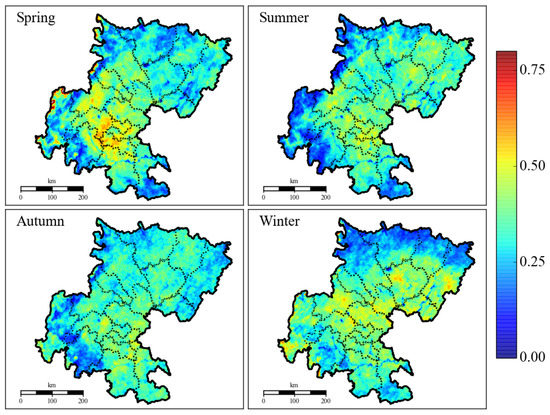 The retrieved AOD distributions (1 km × 1 km) based on the DDV algorithm over the Sichuan Basin in four different seasons are explicitly illustrated in Figure 3. The retrieved results also showed that higher AOD values were distributed in the central and northeastern parts of the Sichuan Basin in winter and spring, especially for the three city groups of Chengdu-Meishan, Bazhong-Dazhou, and Zigong-Yibin-Luzhou, but had homogeneous and lower AOD distributions depicted in summer and autumn. The pattern of spatial distribution for AOD was consistent with the emission distributions of anthropogenic particulates from the Multi-resolution Emission Inventory for China (MEIC) [55], which is mainly related to the urban agglomeration of the Chengdu plain and the northeast agglomeration of industry and transportation development. The highest relative humidity and temperature were reported in July and August in the Sichuan Basin, which would enhance the formation and conversion of secondary organic aerosols (SOAs), and the AOD values presented as higher values when compared to other regions in China (e.g., Northeast China) [56,57]. Regional statistics of annual AOD over the Sichuan Basin from March 2000 to February 2010 was reported as 0.848 by MODIS Atmosphere level2 Aerosol Product with resolution 1° × 1° [56]; however, the latest study from Liu [57] showed that the annual AOD values were 0.33 for the Sichuan Basin and 0.65 for the city of Chengdu with the MODIS AOD (3 × 3 km). The revised results from high-resolution MODIS images presented as 0.29 for the Sichuan Basin and 0.57 for Chengdu, respectively.