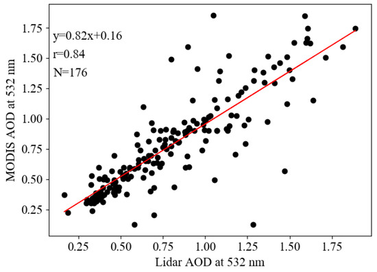 To further verify the accuracy of the revised high-resolution AOD, the observed AOD values of ground-based scanning Lidar were collected from the super-monitoring station of Southwest Jiaotong University. As the station is located in the overland part of a suburban area, the observed Lidar AOD was dramatically varied due to the changes in meteorological factors. Thus, the ground-based Lidar data from 176 days were specifically extracted according to the satellite transit time, and the correlation between the MODIS AOD and Lidar AOD is illustrated in Figure 4. The highest correlation (r = 0.84) under the condition of 95% confidence indicated that the spatial and temporal distribution of high-resolution AOD could be applied to further retrieve the PM2.5 concentrations. A similar coefficient was also reported as 0.78 when compared to the Lidar AOD at a 1 km resolution MODIS AOD taken at the Hong Kong International Airport from January 2006 to September 2007 [58].