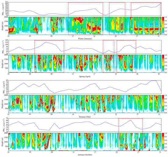 The time series variations between the monitored PM2.5 concentration from the ground site and the vertical profile of particle extinction are depicted in Figure 6. With the Lidar measurements, it was found that when the concentration of particulate matter was high, the high extinction coefficient was mainly concentrated at about 500–800 m in winter and spring. This can be explained by the shallow PBLH severely limiting the diffusion of pollutants in the vertical. However, the higher values of particle extinction frequently fluctuated between the heights of 200 m to 2000 m in summer and autumn. Moreover, it was identified that the distribution of profiles in different seasons had a similar variation trend, thus a yearly fitting was conducted to obtain the linear and exponential functions for the vertical correction in retrieval ground-level PM2.5 concentration.
