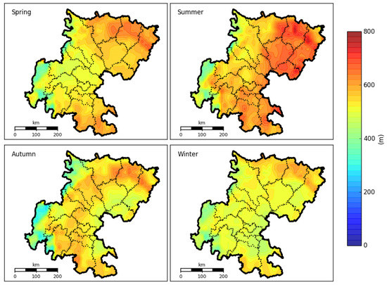 The increasingly available Lidar-based aerosol extinction profiles provide insights into the boundary layer as well as the residual above it, but only very limited numbers of the instrument are located in the study regions. To obtain the spatial distribution of PBLH over the whole Sichuan Basin, we simulated the PBLH using the numerical models of WRF and WRF/CALMET, and further compared them with the data from ground-based Lidar. The simulated results for four PBLH parameterization schemes (GBM, SHIN, TEMF, UW) from WRF, along with the result from WRF/CALMET over the Sichuan Basin are illustrated in Figure 7. The results showed that the height of PBLH in winter was the lowest (346 m), followed by autumn (467 m), spring (496 m), and summer (585 m). It also clearly showed that the heights of PBLH were higher in the northeastern part of the Sichuan Basin than in the western part that adjoins to the steep edge of the Tibetan Plateau.