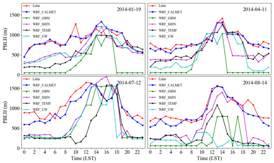 In Figure 8, diurnal Lidar observations were selected as the benchmark data, then compared with the extracted WRF and WRF/CALMET simulation results for the site of Southwest Jiaotong University on randomly selected dates (7 January, 21 April, 20 July, and 11 August, 2014). The height of the boundary layer observed by Lidar was in good agreement with the simulated boundary layer by the SHIN scheme than with the other three schemes in WRF. The simulation result from WRF with the SHIN scheme was input as an initial-guess field in the CALMET model to further simulate the wind field and PBLH with finer resolution. However, both the correlation and the variation tendency of WRF/CALMET were closest to the observation than that of the four WRF schemes. It is also verified that the WRF/CALMET with surface wind field diagnosis was more flexible than WRF when simulating atmospheric boundary height in complex terrain such as in basin and mountain areas [64].