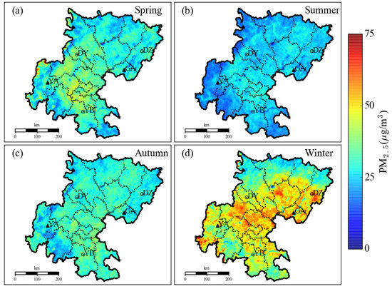 The temopal and spatial distribution of retrieved high-resolution PM2.5 concentrations across the Sichuan Basin during 1 November 2013 to 31 October 2014. (a–d) spring, summer, autumn and winter, respectively.