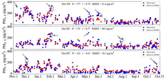 In spring, the lower correspondence between MODIS retrieved and ground-based measured PM2.5 were mainly occurred at DZ (2 February, 3 February and 4 February) and YB (1 February, 2 February and 4 February) as arrow marked points in Figure 13a. This period is traditional Spring Festival in China with heavily burning of fireworks and crackers which would lead to a sharp increase of sulfur dioxide and particulate matter concentrations in the atmosphere. Due to the optical extinction of aerosol released from fireworks is higher the urban background aerosol which used in our retrieval algorithm, and the result of higher MODIS retrieved PM2.5 concentration. Another typical case in spring was occurred on the day of 14 April at DZ. The precipitation was observed at the site, and it caused that the usage of fitted hygroscopic growth factor (which lower than the actual atmospheric conditions) would result in higher retrieved surface PM2.5 concentration.