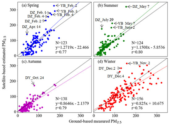 While in autumn and winter, the cold air has weak effect on the Sichuan Basin, aerosol particles from heavy local industrial emissions could not diffuse well, it explains the fitted slopes are less than 1.0 in Figure 13c,d. Additionally, there are substantial water vapors suspended in the air due to the fog in the autumn and winter morning, and thus large deviations between the evaluated and ground-level measured PM2.5 concentration were obtained in cases of DY_Oct_24, YB_Nov_2, DY_Dec_2 and DY_Dec_4.